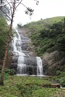 Silver Cascade, 8 kilometres (5.0 mi) from Kodaikanal at a wide bend in the long and winding Laws Ghat Road, at altitude 1,800 metres (5,900 ft), is a 55-metre (180 ft) waterfall formed from the outflow of Kodaikanal Lake.[41] This waterfall is a common stop for first-time visitors. There are a few souvenir and fruit vendors and many monkeys here. There is also a smaller waterfall below the bridge which crosses the stream here.