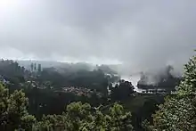Green Valley View (formerly called Suicide Point), 5.5 kilometres (3.4 mi) from the bus-stand and near the golf course, has a panoramic view of the plains and a sheer drop of 1,500 metres (4,900 ft) overlooking the Vaigai Dam to the south. The stairway leading up to it is highly commercialized and lined with rows of shops to tempt tourists.[31]