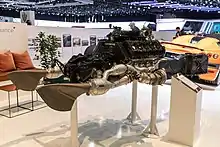 The Internal Combustion Engine (ICE) is a mid-rear mounted, in-house developed, twin-turbocharged V8 engine with a 5.0-litre displacement. It has four valves per cylinder, each with a bore and stroke of 92 mm × 95.25 mm (3.62 by 3.75 inches) and a compression ratio of 9.3:1. The engine utilizes dry sump lubrication and dual overhead camshafts, and has a cylinder bank angle of 90º.[20] It is rated at 820 kW (1,100 hp; 1,115 PS) at 7,800 rpm and 1,280 N⋅m (944 lb⋅ft) of torque at 4,100 rpm on 95 octane RON gasoline. A flex fuel sensor is installed in the fuel tank to detect E85 biofuel, which increases this power output by an unspecified amount.[21] The ICE is rev-limited at 8,250 rpm.[22]