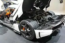 The Regera features a similar suspension layout to the preceding Agera models, with double wishbone suspension at the front and rear axles.[33] The wishbones are manufactured from chrome-molybdenum steel tubes, which was chosen over carbon-fibre due to the significant cost and complexity of the latter option.[34] The suspension incorporates special "Z" shaped anti-roll bars that connect to the body at only one point (as opposed to two for traditional "U" shaped bars). Also returning from the Agera models is Koenigsegg's 'Triplex' damper system, which consists of three custom Öhlins shock absorbers on the rear suspension subsystem.[34] While anti-dive forces under heavy braking are achieved by obliquely mounting the top wishbones in the front of the car, this mounting position could not be achieved in the rear. Therefore, the purpose of the third 'Triplex' rear damper is to provide anti-squat forces under hard acceleration.