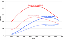 The Regera has a reported total power output of 1,340 kW (1,797 hp; 1,822 PS) through a hybrid powertrain. As in general, the Regera's internal combustion engine (ICE) generates its greatest power only at high rpm; however, due to the fixed gear, this corresponds to very high speeds. Power at low speeds is filled in by the electric motors, giving a maximum combined mechanical power output of 1,119 kW (1,500 hp; 1,521 PS) and 2,000 N⋅m (1,475 lb⋅ft) of torque.[10][18][19]