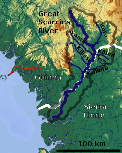 The Little Scarcies River empties into the same bay of the Atlantic Ocean just to the south of the Great Scarcies River. This area was settled by the Temne people who migrated from Futa Jalon to the north.[1]