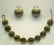 A pair of kolts featuring two birds flanking the tree of life and a ryasna, a chain of medallions, found in 1842 in or near the Church of the Tithes in Kiev). Cloisonné enamel on Gold. 12th century.