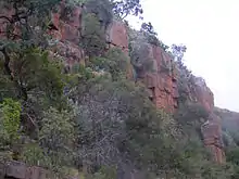Komati Gorge is a river valley in the Mpumalanga Province in central South Africa, which features vertical sandstone cliffs that provide habitat for a wide diversity of wildlife. Komati Gorge is located near the communities of Carolina and Machadodorp. The Komati River flows through the gorge and provides riparian cover for many species of flora and fauna, including several endemic endangered species and big game animals. The geology of the vertical cliffs of the gorge offer a diverse set of colourful mineralized exposures.