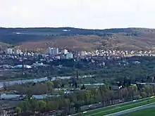 The southern part of Komořany is bisected by Prague's Outer Ring Road. The ring road crosses the Vltava river valley above grade - a structure known as the Radotínský Bridge. The east of the bridge lands in Komořany, where an unfinished intersection awaits the completion of the Komořany bypass, before continuing on into the east portal of the Komořany tunnel. There was a dispute over the partial construction of the intersection, fueled by controversy over construction of the bypass itself and irregularities in the building permits.[5][6]