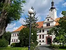 Komorní Hrádek is home to the Chateau Komorní Hrádek. Originally, a castle called Veselé was founded by Racek Kobyla of Dvorce, the burgrave of Vyšehrad. This was permitted by King Wenceslas IV on 28 August 1412,[5] however, the castle was most likely completed before Wenceslas authorized it.[5] The castle was likely the replacement for the older Čejchanov (see above), only 200 meters to the west.[3] The reason for Veselé replacing Čejchanov was likely Čejchanov's unsuitable position that rendered the castle easily endangered by firearms.[3]
