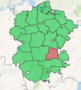 Komsomolsky District (Russian: Комcомо́льский райо́н; Chuvash: Комсомольски районӗ) is an administrative[1] and municipal[6] district (raion), one of the twenty-one in the Chuvash Republic, Russia. It is located in the southeast of the republic and borders with Kanashsky District in the north, Yalchiksky District and the Republic of Tatarstan in the east, Batyrevsky District in the south, and with Ibresinsky District in the west. The area of the district is 630.3 square kilometers (243.4 sq mi).[3] Its administrative center is the rural locality (a selo) of Komsomolskoye.[1] Population: 26,951 (2010 Census);[4] 27,273 (2002 Census);[8] 28,627 (1989 Census).[9] The population of Komsomolskoye accounts for 18.2% of the district's total population.[4]