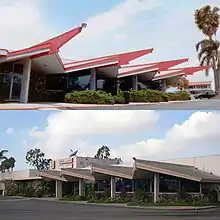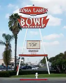 Kona Lanes opened in 1958, featuring the Tiki-inspired signage and architecture that became popular following World War II,[1] including what the Los Angeles Times called its "flamboyant neon lights and ostentatious rooflines meant to attract motorists like moths".[2] The building on Harbor Boulevard near Adams Avenue was one of three in the Googie style that architects Powers, Daly, & DeRosa designed at around the same time;[3] Kona Lanes and its sister center, Java Lanes,[4] used names that suggested South Pacific island locales.[3] Author Andrew Hurley called them "expensive and attractive buildings that screamed, 'Have fun here'",[5] and Kona retained much of that atmosphere over the years. Its massive neon-lit street sign remained for the life of the building,[6] and Kona was the only bowling establishment in the area to reject automatic scoring equipment throughout its existence.[7]