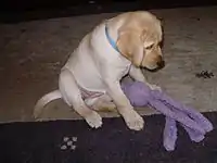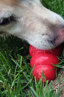 The classic Kong toy resembles a snowman-like structure of three balls pushed together. They also come in several variations for dogs of different ages and sizes. Made of rubber, they are hollow in the middle, and can be stuffed with treats[4] or frozen to provide longer distraction for dogs. The classic Kong product is also offered in different rubber types, tailored to dogs of different chewing capabilities and different ages.