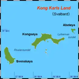 Kong Karls Land or King Charles Land is an island group in the Svalbard archipelago, in the Arctic Ocean. The island group covers an area of 342 km2 (132 sq mi) and is made up of the islands of Kongsøya, Svenskøya, Abel Island, Helgoland Island, and Tirpitzøya.