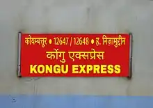 The 12647 / 12648 Kongu Express is a Superfast weekly train run by Indian Railways between Coimbatore Junction and Hazrat Nizamuddin. The train was named after the Kongu region of Tamil Nadu, called Kongu Nadu. The train made its inaugural run on 3 April 2000.