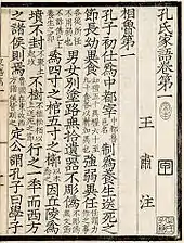 The postface to the Kongzi Jiayu asserts that it was compiled by Kong Anguo, an influential scholar and descendant of Confucius who lived in the 2nd century BC, from actual recordings of Confucius' sayings made by his disciples.[9] Soon after Wang Su, who was a critic of the scholar Zheng Xuan, published his version of the Jiayu, Ma Zhao (馬昭), a follower of Zheng, declared that it had been "amended and enlarged" by Wang.[10]