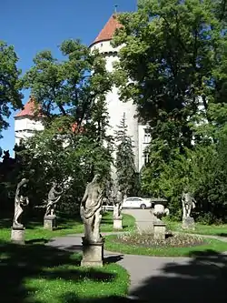 Archduke Franz Ferdinand of Austria bought Konopiště in 1887 with his inheritance from the last reigning Duke of Modena. He had it repaired between 1889 and 1894 by the architect Josef Mocker into a luxurious residence, suitable for a future Emperor, which he preferred to his official residence in Vienna. The extensive 225 ha (550-acre) English landscape garden with terraces, a rose garden and statues, was established at the same time.[2]