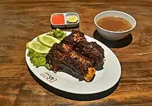 Konro is an Indonesian rib soup originating with the Makassarese people[1] of South Sulawesi. Usually this soup was made with ribs, such as spareribs[1][2] or beef as main ingredient. The soup is brown-black in color and eaten either with burasa or ketupat cut into bite-size pieces or rice. The spicy and strong-tasting soup is made from a mixture of rich spices, which includes coriander, keluwak (Pangium edule); a fruit that gives it its blackish color, also small amount of nutmeg, turmeric, galangal, cinnamon, tamarind, lemongrass, clove, and salam (Indonesian bayleaf).[3]