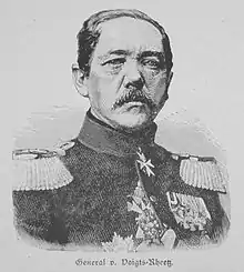 Voights-Rhetz was borned in Seesen in the Duchy of Brunswick, then part of the short-lived Kingdom of Westphalia. He entered the Adolfinum-Gymnasium in Bückeburg at the age of 10, and would excell in math, science, history and description of the earth.[1] Voigts-Rhetz entered the Prussian 9th Infantry Regiment in 1827 and was made an officer in 1829. Between 1833 and 1835 Voigts-Rhetz attended the Prussian Military Academy. In 1837 he was attached to the topography division. He joined the General Staff in 1839 and was promoted to captain in 1841 and major in 1847.