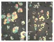 In his effort to push the production yield further he then focused his research on the simple arc method (1) that culminated in 1990 in a yield of > 1 gram per day[4] achieved by a robust and highly efficient arc process. As the fullerene material, however, was still embedded in the generated soot Fostiropoulos developed two possible extraction methods, either by applying thermal evaporation to expel the molecular species C60, C70... from the soot under vacuum conditions or by dispersing the soot in benzene where only fullerenes dissolve. The extracted powder of this "natural" pure fullerene mixture was analyzed by optical (UV to IR) as well as mass spectroscopy where also the "American football" shaped C70 was found. From the powder he could grow for the first time ultra-thin C60 films by vacuum thermal evaporation and watch the formation of hexagonal crystals from the "wine-red" benzene solution. From subsequent thin film chromatography studies[18] the wine-red colour turned out to originate from the 10% C70 fraction in the natural fullerene mixture. The mass density of the novel Carbon crystals was determined experimentally as well as theoretically using data from a TEM crystal analysis measured for the first time in collaboration with Werner Kühlbrandt,[19] EMBL Heidelberg, where the van der Waals diameter of the molecular "football" was determined: dC60= 1.0 nm. In collaboration with Hans Hermann Eysel, Institute of Inorganic Chemistry, Heidelberg University, for the first time Raman spectra of C60 have been measured.