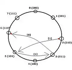 Step 3) Node #3 routes the message to Node #6 (using its connection to 2i mod8), shifts the bits left and puts “0” as the youngest bit (right side).