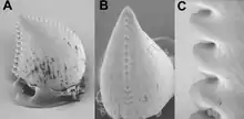 The tooth is two millimeters tall and very recurved, with a strongly convex front edge and a nearly vertical back edge. The tooth is stout, with a maximum fore-aft length of 1.9 millimeters. Both edges are serrated, showing low rectangular denticles (individual serrations). The twelve denticles on the rear edge are much higher than the fourteen on the front edge, which cover only the nearly horizontal upper part of the front edge. The tooth base, though very wide, is constricted. The base is asymmetrical, with the right side in front view protruding much further than the left side; because it is not known whether it is a left or right tooth, it cannot be established what is the inner and what the outer side. The denticles are separated by "blood grooves", and "blood pits" are also present. The back denticles point obliquely upwards but have no hooked upper corners.[2]