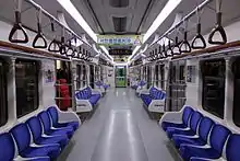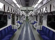 The 1st and 2nd generation Class 351000 trains used an ivory-colored interior with a long sheet prior to their overhauls. All 1st and 2nd generation trains, as well as subsequent generation, use a white interior. LED display monitors are installed on the top of each car. The end cars have a space for wheelchairs.