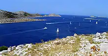 The Kornati archipelago (pronounced [kɔ̝rnǎːti]; Italian: Isole Incoronate) of Croatia, also known as the Stomorski islands, is located in the northern part of Dalmatia, south from Zadar and west from Šibenik, in the Šibenik-Knin County. With 35 kilometres (22 miles) length and 89 islands, some large, some small, in a sea area of about 320 square kilometres (124 sq mi), the Kornati are the densest archipelago in the Mediterranean Sea.[1] From northwest to southeast (from the island of Balabra to Samograd), and from northeast to southwest (from Gangarol to Mana) they stretch for 13 km (8 miles). The name of the archipelago is the plural form of the name of the largest island, called Kornat.