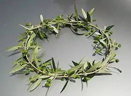 The olive wreath, also known as kotinos (Greek: κότινος),[1] was the prize for the winner at the ancient Olympic Games. It was a branch of the wild olive tree[2] Kallistefanos Elea[3] (also referred to as Elaia Kallistephanos)[4] that grew at Olympia,[5] intertwined to form a circle or a horse-shoe. The branches of the sacred wild-olive tree near the temple of Zeus were cut by a pais amphithales (Ancient Greek: παῖς ἀμφιθαλής, a boy whose parents were both alive) with a pair of golden scissors. Then he took them to the temple of Hera and placed them on a gold-ivory table. From there, the Hellanodikai (the judges of the Olympic Games) would take them, make the wreaths and crown the winners of the Games.[6]