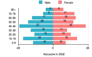 According to the 2002 Poland census, there were 290 people residing in Kotuszów village, of whom 52.1% were male and 47.9% were female. In the village, the population was spread out, with 21.7% under the age of 18, 30.7% from 18 to 44, 24.5% from 45 to 64, and 23.1% who were 65 years of age or older.[1]