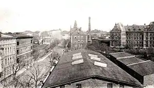 The area was part of a former suburb called Okole that covered artificial islands from Brda river forks nearby Bydgoszcz Canal. In the first half of the nineteenth century, this area remained almost undeveloped. The situation changed in the second half of the 19th century, when industrial plants and residential complexes, following industrial revolution in Prussia, were established. Królowej Jadwigi Street was then laid out in 1860 together with the development of Bydgoszcz thanks, in particular, to the rapid grow of the railway traffic.[1] The thoroughfare connected then the train station area to the Bydgoszcz Canal.