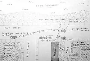 They sped off, coming under fire by restaurateur Winfield Kern, Vernon Townsend, and Farmers Store clerk Ed Grutt (also spelled Grudt), with Frank Webber returning fire. In the firefight, Frank Webber was killed. As the robbers fled down U.S. Route 12, pursued by armed vigilantes and the sheriff, Ike Harmon, they paused on Suckow Road to throw Webber's dead body onto the road and kill James Kraft. Shortly afterwards, they threw Charles Preston Harmon onto the road, where he died soon after. The two men disappeared soon after.[3] In the ensuing hunt, District Attorney A. W. Galvin accused Richard Newman and Leonard Hankins of being the robbers, but they were found innocent.[5] Richard Newman, when asked "Have you been through Menomonie, Wisconsin?"replied, "I have been through Menomonie, yes, sir." Then the prosecutor asked "Isn't it a fact that on Oct. 18, 1931, you and Hankins entered the Kraft State Bank at Menomonie, Wisconsin with guns in your hands?" Newburn attempted to answer, "Mr. Compton, I…" Compton yelled, "Answer that 'yes' or 'no'!" To which Newburn replied, "It is not a fact, no sir, I never robbed a bank in my life in no town or no place." At which point they were found innocent.[4]
