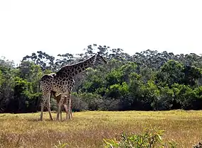 ![]() South African giraffe calf suckling on mother | |