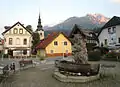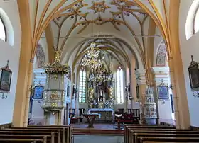 The Counts of Ortenburg established a church dedicated to Our Lady on the White Gravel (Slovene: Marija na belem produ) in the 14th century,[5] referring to the bank of the Pišnica River, which has since changed course.[6] The current church, dedicated to the Assumption of Mary, is late Gothic in style and has typical Carinthian rib vaulting. It contains two sculptures from the second half of the 15th century and paintings by Leopold Layer (1752–1828).[5]