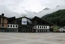 ![]() General view of the Krasnaya Polyana from the Psekhako Ridge. In the foreground is a mountain Olympic village. | |