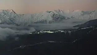 ![]() General view of the Krasnaya Polyana from the Psekhako Ridge. In the foreground is a mountain Olympic village. | |