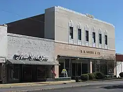 The Kress Building is a historic commercial building at 210 West Main Street in Blytheville, Arkansas. It is a two-story concrete and steel structure, faced in brick and terra cotta. Built in 1938, it was one of the first buildings in the city to be built using steel framing, and is one of its finest Art Deco structures. The first floor areas (outside the plate glass store windows) are faced in terra cotta, while the second floor is predominantly cream-colored brick. Windows on the second floor are surrounded by ivory terra cotta incised with fluting and shell patterns.[2]