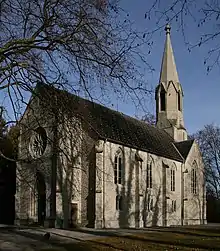 The nave - with an integrated transept under a gable roof and a choir tower - is surrounded by a cemetery to the north. The hall room has an open timber roof truss and a wooden gallery. In the choir, on the right is a war memorial to the First World War with a crucifix made of stone by Albert Bechtold from 1923.[2]