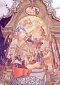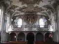 The ceiling paintings by Franz Ludwig Herrmann show scenes from the monastic life of Saint Augustine of Hippo. The magnificent choir screen was made in 1737 by Johann Jakob Hoffner. The statues, larger than life-size, of Saints Ulrich and Afra were carved by Hans Christoph Schenk. Of particular interest is the Chapel of the Mount of Olives with a crucifix and a Calvary. The ceiling painting shows Moses with the brazen serpent and is also by Franz Ludwig Herrmann (1761). The representation of the Mount of Olives, made out of beechwood by Innozenz Beck, contains about 250 original statuettes, about 30 centimetres high, carved of Swiss stone pine wood ("Arvenholz") in about 1720-1730 somewhere in the south-eastern Alpine region.