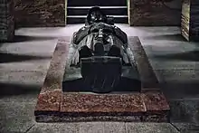 In the middle of a rectangular pit an open crypt is located, containing the statue of a fallen soldier.