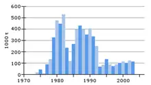 The annual catch of Euphausia superba since the mid-1990s is about 100–120,000 tonnes annually, i.e., about one fiftieth of the CCAMLR catch quota. Still, the CCAMLR is criticized for having defined its catch limits too generously, as there are no precise estimates of the total biomass of Antarctic krill available and there have been reports indicating that it is declining since the 1990s.[13] Plans to take up to 746,000 tonnes a year were disclosed at the 2007 meeting of CCAMLR.[14][15]