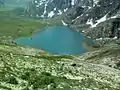 Krishansar in Sanskrit and Kashmiri means the lake of Krishna. It is home to many types of fishes[3] among of which is the brown trout.[4] It freezes during winter, and is inaccessible during this season due to heavy snowfall. It is surrounded by green lush meadows and attracts local shepherds who graze their flocks of sheep and goat during summer. The Krishansar Lake is adjacent to Vishansar Lake, at its back are the mountains standing covered with snow in which lies the Gadsar Pass, a mountain pass which leads to the Gadsar Lake. The lake is a famous trekking site just north of the Kashmir Valley. It is mostly fed by melting of snow and glaciers. It drains out through a small stream which falls into the Vishansar Lake and gives rise to Neelum River.[5]