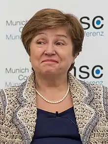 Kristalina Ivanova Georgieva-Kinova (Bulgarian: Кристалина Иванова Георгиева-Кинова; born 13 August 1953)[1] is a Bulgarian economist serving as chair and managing director of the International Monetary Fund since 2019. She was the Chief Executive of the World Bank Group from 2017 to 2019 and served as Acting President of the World Bank Group from 1 February 2019 to 8 April 2019 following the resignation of Jim Yong Kim. She previously served as Vice-President of the European Commission under Jean-Claude Juncker from 2014 to 2016.