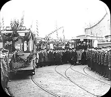 By 1897 the Liberal Party had received a majority in the municipal council. The party had as part of its program stated that it wanted to municipalize the tramway operations.[22] That year there was a political debate regarding an expansion of the KSS' tramway towards St. Hanshaugen and Sagene, two areas which were being developed. KSS applied to build a tramway there, but on 23 September 1897 the municipal council voted to establish its own tram company, Kristiania Kommunale Sporveie (KKS), and build a line to St. Hanshaugen Sagene itself.[23] This resulted in three new lines. Sagene Ring opened in November 1899.[24][25] The Rodeløkka Line, which opened in January 1900, used the lower section of the Grünerløkka Line to reach the city center. The Vippetangen Line was completed in August. However, none of the three lines connected with each other and KKS had to lease track from KSS.[26]