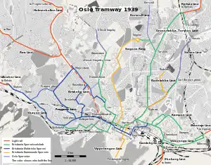 KSS operated a network of tramway throughout most of eastern and northern Oslo. Through the city center it followed Karl Johans gate to Stortorvet, its hub. To the east the lines ran concurrently to Kirkeristen, where the Grünerløkka–Torshov Line split from the Oslo Line (later name the Gamlebyen Line). The latter ran through Grønland along Vognmannsgata and Schweigaards gate. The Oslo Line proper ran through Oslogate to St. Halvards plass and onwards to Oslo Hospital in Gamlebyen (at the time known as Oslo). From here the suburban Ekeberg Line, operated by Ekebergbanen continued southwards.[18] Two lines branched off from the Oslo Line. The Kampen Line ran along Motzfeldts gate, Jens Bjelsens gate, Tøyengata, Hagagata and Brinkens gate to Kampen, Norway.[10] Further down the Vålerenga Line branched off at Schweigaards gate and continued along it, St. Halvards gate, Vålerengagata and Etterstadgata.[18]