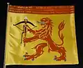 The regiment has carried a number of different colours over the years. The last colour was presented to the regiment in Växjö by the Chief of the Army, lieutenant general, count Carl August Ehrensvärd on 6 June 1956.[2] The new colour replaced the one from 1893.[3] The new colour was used as regimental colour by I 11/Fo 16 until 1 September 1997. The colour is drawn by Brita Grep and embroidered by hand in insertion technique by Libraria. Blazon: "On yellow cloth the provincial badge of Småland; a red lion rampant with blue arms, in the forepaws a red crossbow with white arrowhead and black bow, string and trigger. On a red border at the upper side of the colour, battle honours (Breitenfeld 1631, Lützen 1632, Wittstock 1636, Landskrona 1677, Kliszow 1702, Warszawa 1705, Fraustadt 1706, Holovczyn 1708, Hälsingborg 1710, Valkeala 1790) in yellow".[2]