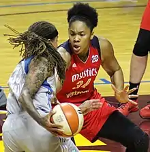 In February 2017, Thomas signed with the Washington Mystics.[8] During the 2017 season, Thomas would have the best season of her career. After the first four games of the season, Thomas was moved from the bench to starting center in the Mystics lineup. On August 4, 2017, Thomas scored 3 points and grabbed a career-high 20 rebounds in a 76–74 loss to the San Antonio Stars.[9] On August 12, 2017, Thomas scored a career-high 20 points along with 14 rebounds in a 100–80 win over the Indiana Fever.[10] By the end of the season, Thomas would average new career-highs in scoring, rebounding, steals, assists and blocks. Following the league's new playoff format from the previous season, the Mystics would finish as the 6th seed in the league with an 18–16 record. In the first round elimination game, the Mystics defeated the Dallas Wings 86–76. Thomas scored 5 points along with 17 rebounds in the win. In the second round elimination game, the Mystics defeated the number-3 seeded New York Liberty 82–68, advancing past the second round for the first time in franchise history. Thomas scored 11 points along with 6 rebounds in the win. In the semi-finals, the Mystics would be defeated by the Minnesota Lynx in a 3-game sweep.