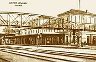 From 1847 to 1848 the line of the Stargard-Posen Railway Company was built through the area. In 1848, the construction of a train station began at the planned junction of the Küstrin-Posen line, with a reception building built in the classical style. The town owes its existence to the rail, as developed only after 1848, when the Poznań-Szczecin line was opened, crossing the Prussian Eastern Railway. In fact its name (Krzyż and Kreuz in English mean cross) reflects the fact that rail lines cross there.
