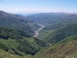The Ksani (Georgian: ქსანი, Ossetian: Чысандон, Ĉysandon) is a river in central Georgia, which rises on the southern slopes of the Greater Caucasus Mountain Range in South Ossetia and flows into the Kura (Mtkvari). It is 84 km (52 mi) long, and has a drainage basin of 885 km2 (342 sq mi).[2] Ksani (both the river and the name) is often associated with the Medieval Georgian Ksani fortress which lies near the confluence of the Ksani and the Mtkvari.