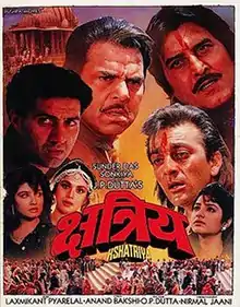 Kshatriya (transl. Rajput Warriors) is a 1993 Hindi-language war film directed by J. P. Dutta. It features an ensemble star cast including Sunil Dutt, Dharmendra, Vinod Khanna, Sunny Deol, Sanjay Dutt, Meenakshi Seshadri, Raveena Tandon and Divya Bharti. Sunil Dutt and Dharmendra play fathers to their real-life sons: Sanjay Dutt and Sunny Deol, respectively. This was Divya Bharti’s last film to be released while she was alive; she died 10 days after its release.