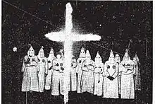 One of the most prominent groups was the Ku Klux Klan of Kanada, whose main principles of white supremacy and nationalism required members to pledge that they were white, gentile, and Protestant.[11] Organizers stated that the Ku Klux Klan was a Christian organization with "first allegiance to Canada and the Union Jack", disqualifying Jews from membership because they are not Christian, and Roman Catholics because their first allegiance is to the Pope in Rome.[14]