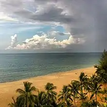 There are two main types of monsoons in the state. The southwest monsoon season is usually established in the later half of May or early June and ends in September. The prevailing wind flow is generally southwesterly and light, below 15 knots. The northeast monsoon season usually starts in early November and ends in March. During this season, steady easterly or northeasterly winds of 10 to 20 knots prevail. The winds over the east coast states of Peninsular Malaysia may reach 30 knots or more during periods of strong surges of cold air from the north (cold surges). The annual rainfall of this area is 2,911 millimetres.[40] During the northeast monsoon season, Kuala Terengganu, being exposed to the coast, receives heavy rainfall. It is not advised to visit any of the offshore islands or participating in sea activities as the sea can be very rough. However, in some clear sunny days during the monsoon season, surprisingly east coast is always presented with clear blue sky and cooling wind.[41][42]