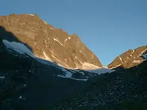 ![]() The Kuchenspitze (top left) and the Großer Kuchenferner glacier (centre and left). The col is the Kuchenjöchli (centre right). | |