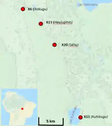 Strictly speaking, Kuhikugu is settlement X11 of this complex, located near Porto dos Meinacos on the eastern shore of Lake Kuhikugu (now Lagoa Dourada) at 12°33′30″S 53°6′40″W. There, as well as at other former settlements of the Kuhikugu complex, satellite imagery reveals that even today the forest differs from surrounding pristine areas, and ground-based exploration reveals this to be an effect of the anthrosol (cf. terra preta), known to the Kuikuro as egepe. Directly to the north of the X11 site there is a Kuikuro village, the small size of which provides an interesting comparison to the large area of egepe which indicates the prehistoric settlement.[4]